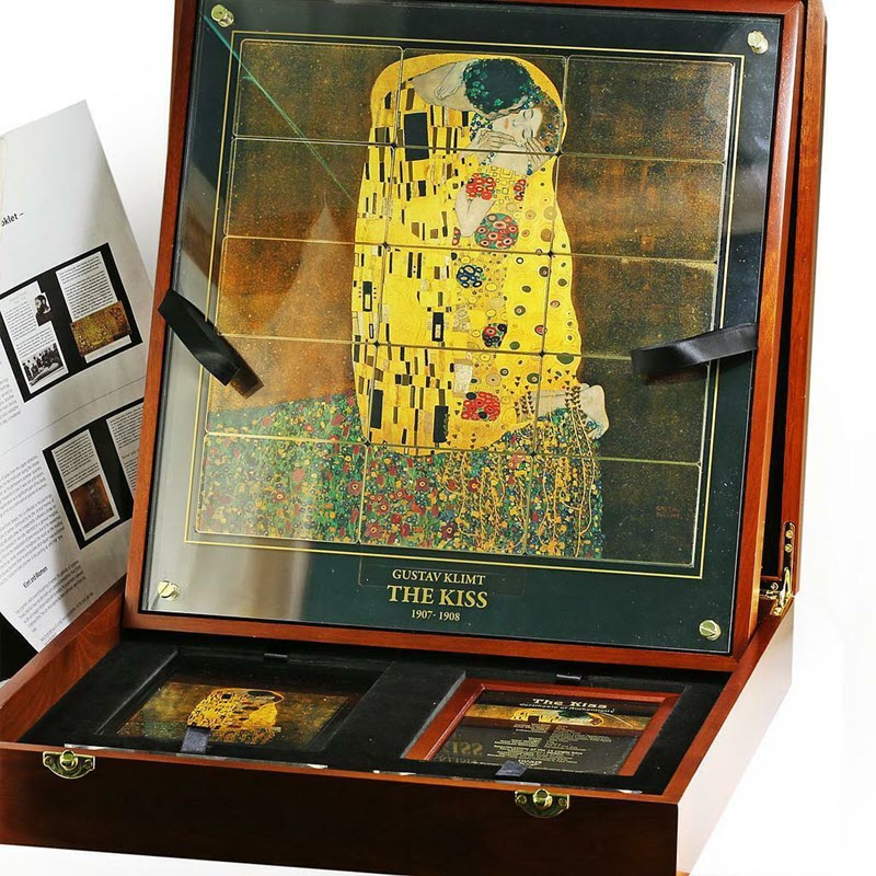 «Поцелуй» Густава Климта — пятый выпуск из серии «Гиганты искусства», премиальной серии огромных высококачественных монет. Это самая крупная монета серии размером 274,5 Х 275 мм, собранная из 15 монет. Все 15 монет упакованы в блок из акрилового стекла. Вся роспись вместе с ободком на каждой из монет выполнена в золоте, поэтому кажется, что ободки отдельных монет почти невидимы. В каждом наборе есть одна монета с индивидуальным номером. Монета поставляется в роскошном деревянном футляре с сертификатом качества и книгой по истории картины. Тираж 750 штук.