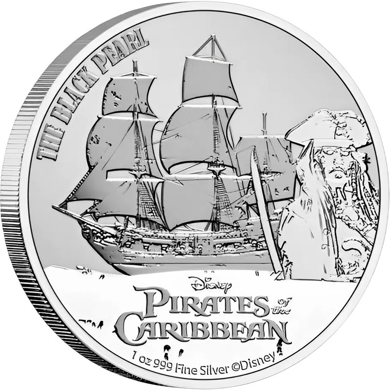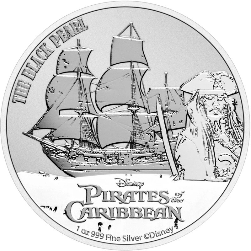 В центре - изображение легендарного пиратского корабля «Черная Жемчужина» на фоне морских волн, справа - стилизованный портрет капитана Джека Воробья (в исполнении Джонни Деппа). Под ним в центре в три строки надписи — Disney PIRATES of the CARIBBEAN (логотип студии и название франшизы). Слева вдоль канта надпись: THE BLACK PEARL («Чёрная Жемчужина»). Внизу вдоль канта надписи: 1oz 999 Fine Silver © Disney (вес и проба серебра, обозначение авторских прав).