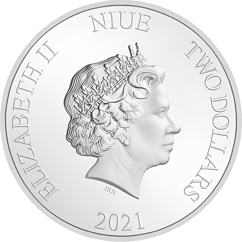 В центре - портрет Ее Величества Королевы Елизаветы II работы дизайнера Яна Рэнка-Бродли. Вдоль канта надписи: ELIZABETH II NIUE TWO DOLLARS 2021 (Елизавета II, страна-эмитент, номинал, год чеканки).