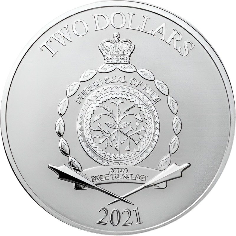 В центре изображена неофициальная «Государственная печать Ниуэ». Это композиция из растений в центре внутри двойного декоративного круга, окруженного морскими раковинами. Он увенчан короной Святого Эдуарда (символом Соединенного Королевства, монарх которого в конечном итоге является главой государства Ниуэ). Вверху между ними надпись PUBLIC SEAL OF NIUE. Ниже на ленте в две строки изображен девиз ATUA NIUE TUKULAGI, ниже которых две перекрещенные катуа. Вверху вдоль канта надпись: TWO DOLLARS (номинал), внизу - 2021 (год чеканки).