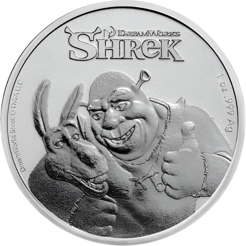 Эта чудесная 1 унцовая серебряная монета выпущена в честь 20-летия мультфильма «Шрек» студии DreamWorks.