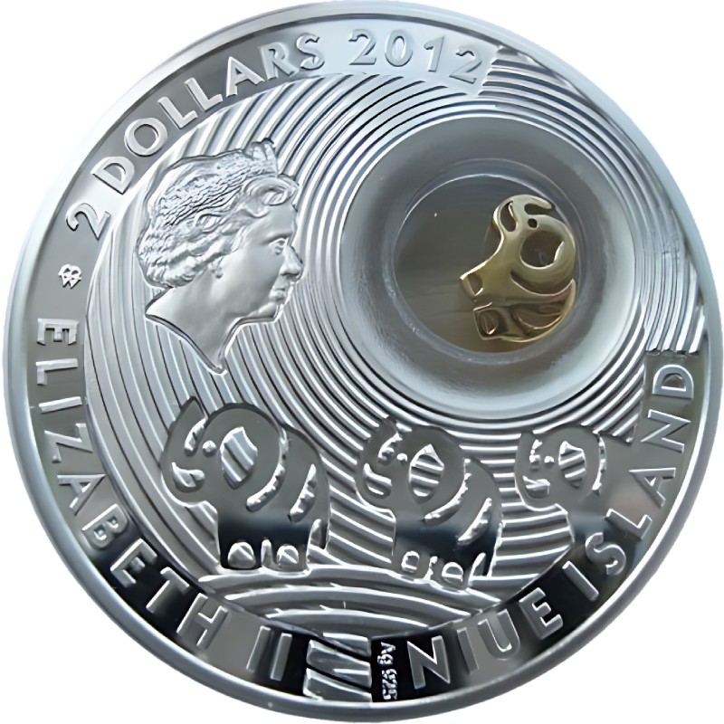 Главная особенность монеты — прозрачная капсула в правой верхней части, внутри которой находится подвижное миниатюрное изображение слона, позолоченное 24-каратным золотом. На фоне расходящихся от капсулы кругов - портрет Ее Величества Королевы Елизаветы II и слонов с поднятыми хоботами. Вдоль канта надписи: ELIZABETH II m/w 2 DOLLARS 2012 Ag 925 NIUE ISLAND (Елизавета II, знак Польского монетного двора, номинал, год чеканки, проба серебра, страна-эмитент).