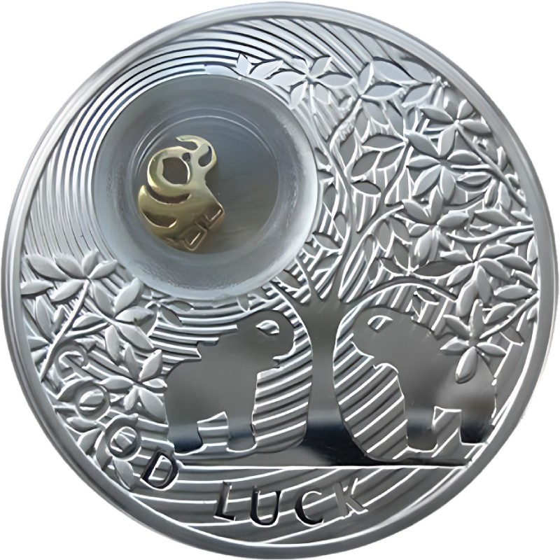 На реверсе изображено дерево и два слона с поднятыми вверх хоботами, а также надпись «GOOD LUCK» (Удачи). Справа внизу - прозрачная капсула с подвижным миниатюрным изображением слона, позолоченным 24-каратным золотом.