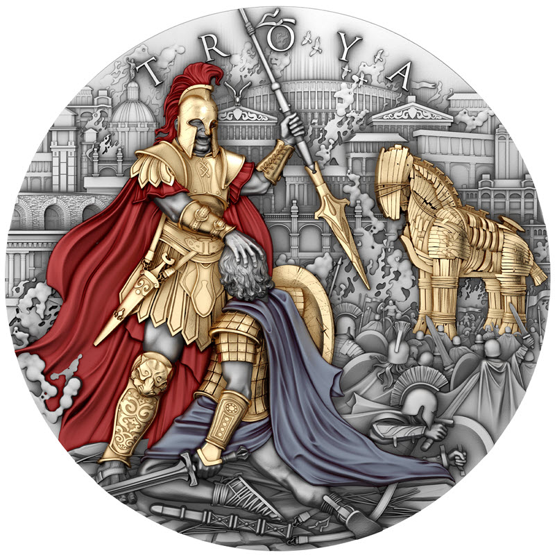 Эта удивительная серебряная монета весом в 2 унции посвящена легендарному городу Троя. У нее качество античной отделки, высокий рельеф и выборочное золочение. Поставляется в оригинальном футляре с сертификатом подлинности. Тираж: 500 штук.