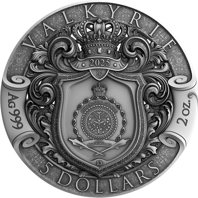На аверсе на щите изображена неофициальная «Государственная печать Ниуэ». Это  композиция из растений в центре внутри двойного декоративного круга, окруженного морскими раковинами. Он увенчан короной Святого Эдуарда (символом Соединенного Королевства, монарх которого в конечном итоге является главой государства Ниуэ). Сверху между ними надпись PUBLIC SEAL OF NIUE. Ниже на ленте в две строки изображен девиз ATUA NIUE TUKULAGI, ниже которых две перекрещенные катуа. Над щитом надпись: • 2025 • TS (год чеканки, монограмма монетного двора), под щитом: 13. Вдоль канта надпись: VALKYRIE Ag 999 5 DOLLARS 2 oz. (название монеты, вес и проба серебра, номинал).