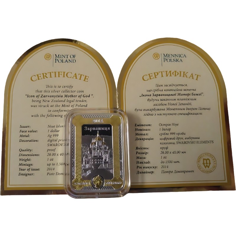 В центральной части монеты - рельефное изображение храмового комплекса Зарваница с позолоченными куполами и Собора Зарваницкой Божьей Матери в Тернопольской области Украины. Изображение расположено в позолоченной фигурной рамке. Над изображением надписи: ЗАРВАНИЦЯ и год чеканки монеты - 2014. Внизу на фигурной рамке позолоченное изображение портрета Ее Величества Королевы Елизаветы II дизайнера Яна Рэнка-Бродли. Справа и слева от портрета надписи: ELIZABETH II (Елизавета II) и NIUE ISLAND (страна-эмитент). Слева вдоль рамки - номинал - 1 $, проба серебра - Ag 999. Справа – монограмма Монетного двора Польши - m/w, вес монеты - 1 oz.