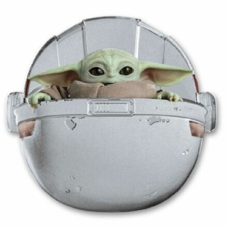 Всеми любимый вымышленный зеленый младенец, которого мы знаем как «Грогу», доступен на этой уникальной раскрашенной серебряной монете весом в 1 унцию в форме персонажа, едущего в парящей капсуле, похожей на детскую кроватку. Тираж — 10000 штук.