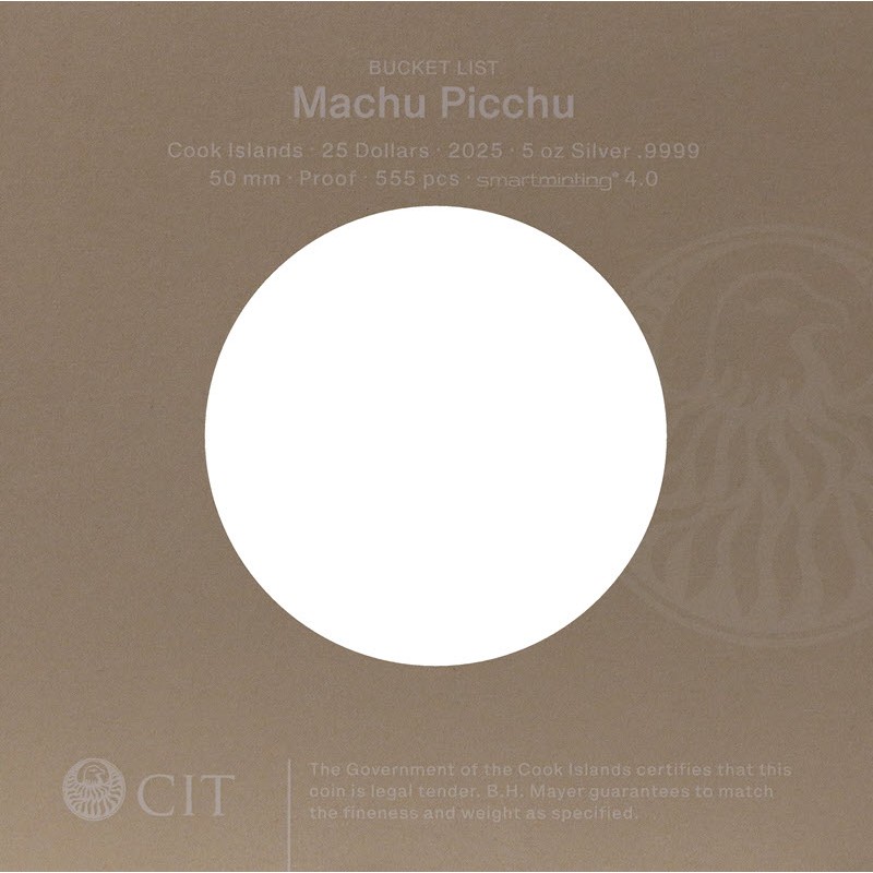 Эта удивительная серебряная монета весом в 5 унции от монетного двора CIT посвящена городу Мачу-Пикчу. Ультравысокий рельеф создан благодаря технологии smartminting® 4.0, у нее качество пруф и селективная окраска. Поставляется в оригинальном футляре с сертификатом подлинности. Тираж: 555 штук.