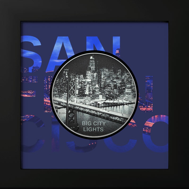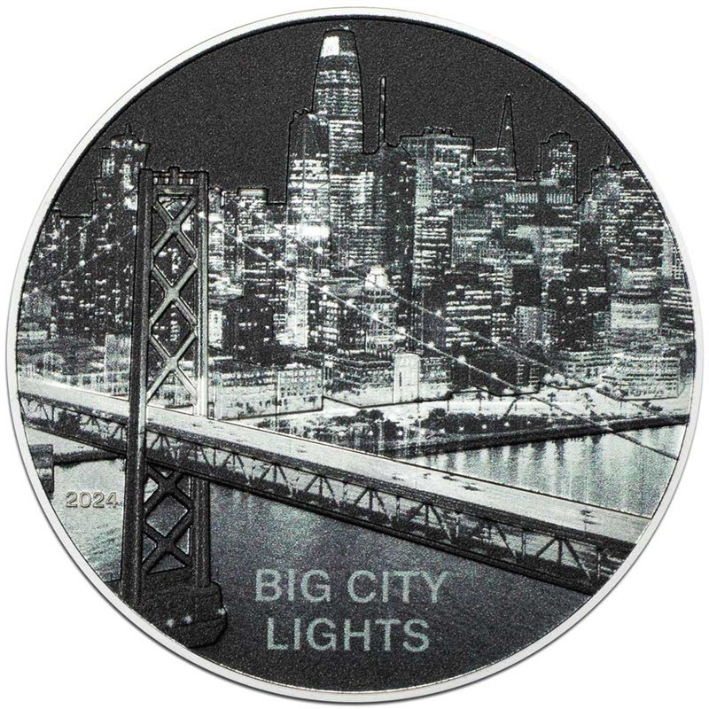 На реверсе изображен вид на Сан-Франциско, включая мост Бэй-Бридж и небоскребы. Слева надпись: 2024 (год чеканки), внизу: BIG CITY LIGHTS.