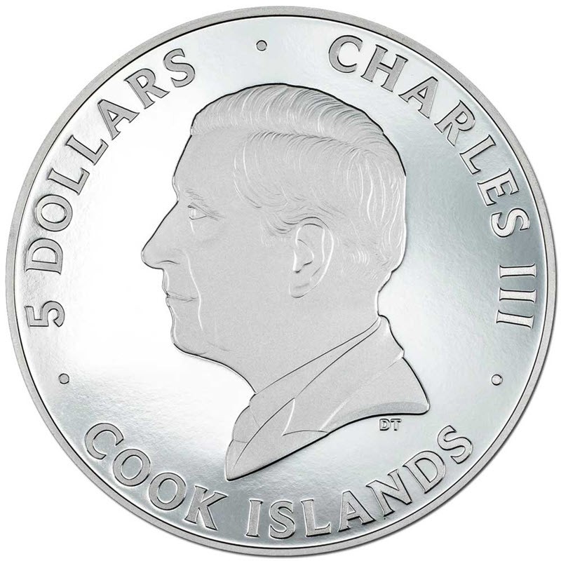 На аверсе изображен Его Величество король Чарльз III. Внизу портрета инициалы дизайнера TD (Dan Thorne). Вдоль канта надпись: 5 DOLLARS · CHARLES III · COOK ISLANDS · (номинал, Чарльз III, страна-эмитент).