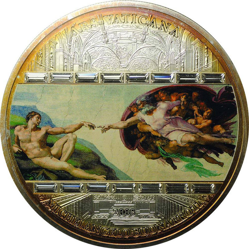 Нумизматический шедевр, изготовленный из чистого серебра 999 пробы весом 3 унции с 16 кристаллами Сваровски, инкрустированными в эту монету диаметром 55 мм. «Сотворение Адама» — фреска Микеланджело, которая является частью потолка Сикстинской капеллы и написана примерно в 1511–1512 годах. Она иллюстрирует библейское повествование о сотворении из Книги Бытия, в котором Бог вдыхает жизнь в Адама - первого человека. Это самое известное фресковое панно Сикстинской капеллы, и его известность как шедевра искусства может соперничать только с Моной Лизой Леонардо да Винчи.