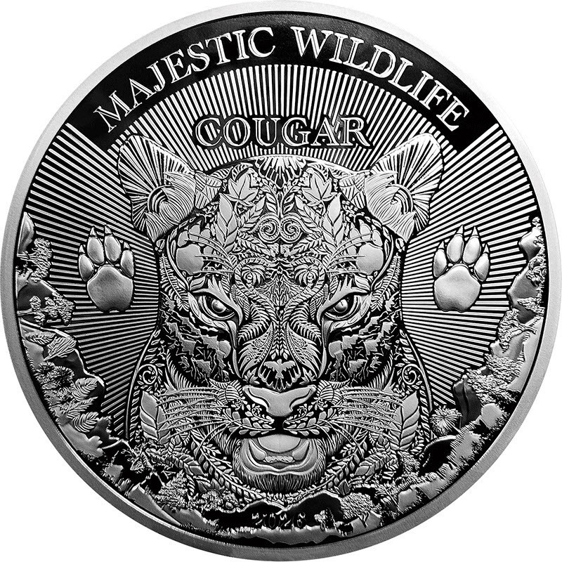На реверсе изображена пума с витиеватым узором на фоне среды обитания. С обеих сторон выгравированы отпечатки лап пумы. Вверху надпись в две строки: MAJESTIC WILDLIFE COUGAR (серия, Пума).