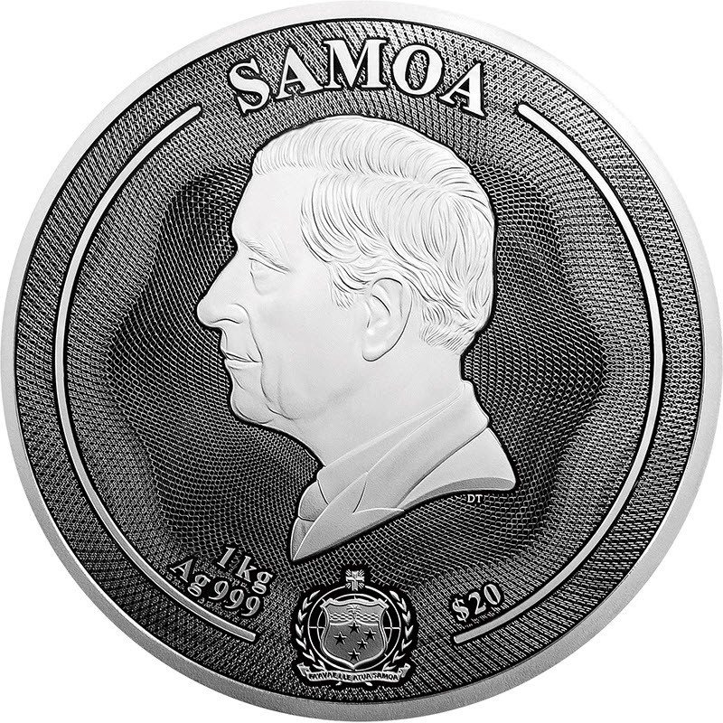На аверсе изображен Его Величество король Чарльз III. Внизу портрета инициалы дизайнера DT (Dan Thorne, Дэн Торн). Над портретом надпись: SAMOA (страна-эмитент), под ним герб Самоа разделяет надпись: 1 Kg Ag 999 $20 (вес и проба серебра, номинал). На гурте выгравирован серийный номер монеты.