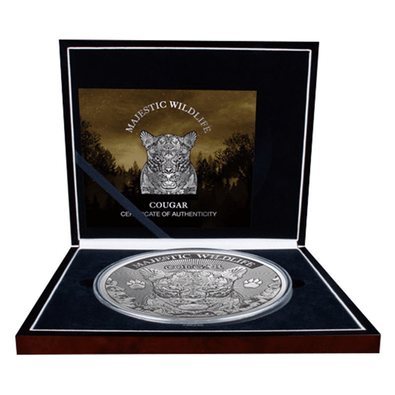 Эта потрясающая серебряная монета весом 1 кг и размером 180 мм – из серии «Величественная дикая природа» (Majestic Wildlife) и посвящена пуме. У нее качество пруф-лайк. Поставляется в оригинальном футляре с сертификатом подлинности. Тираж: 199 штук.