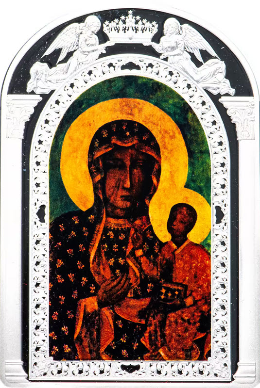 Серебряная монета с изображением иконы Божьей Матери Ченстоховской.
