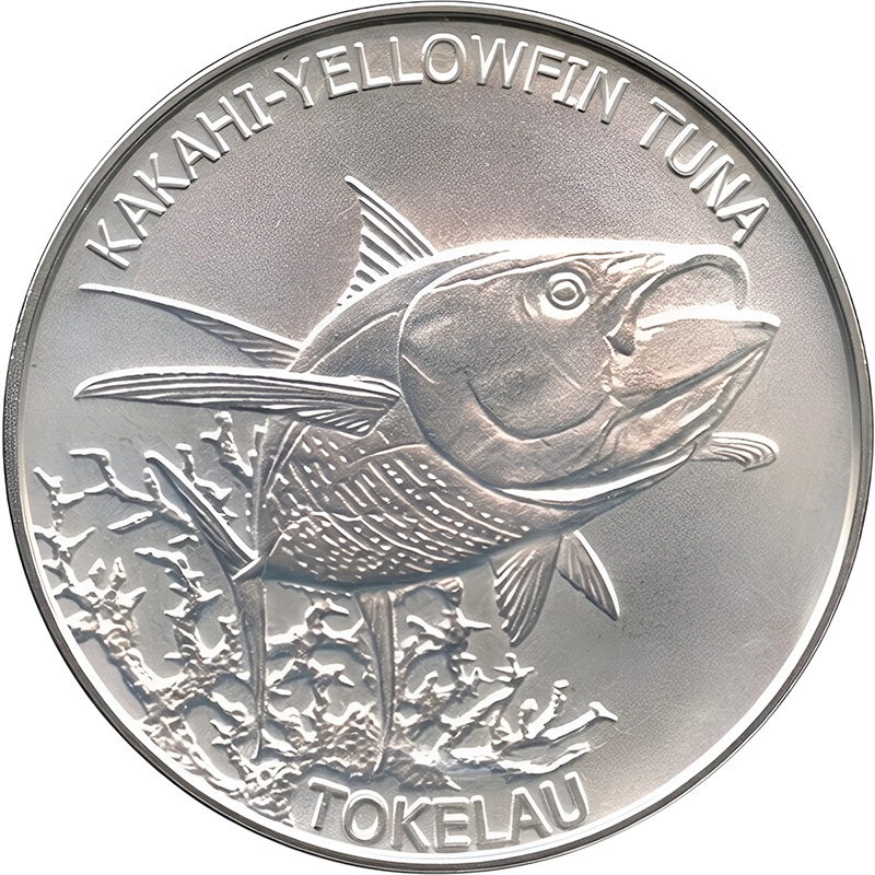 На этой чудесной серебряной 1 унцовой монете Токелау 2014 года выпуска изображен желтопёрый тунец (на языке местных жителей — Kakahi). Она является частью серии, посвященной морской фауне этого региона.
