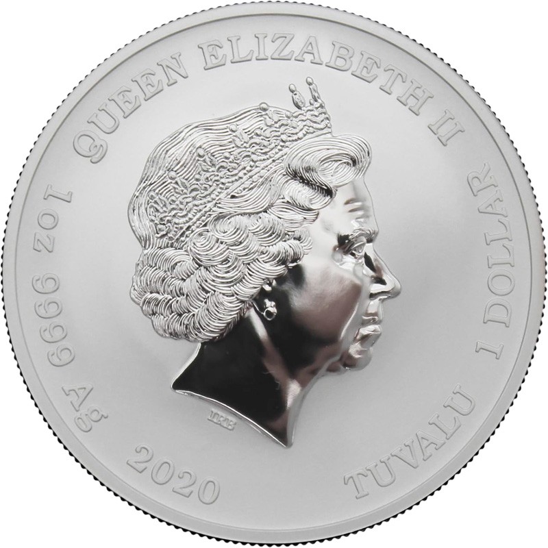 В центре монеты изображен портрет Её Величества Королевы Елизаветы II дизайнера Яна Рэнка-Бродли (IRB). Вдоль канта по кругу надписи: QUEEN ELIZABETH II 1 DOLLAR TUVALU 1 oz 9999 Ag 2020 (Королева Елизавета II, номинал, страна-эмитент, вес и проба серебра, год чеканки).