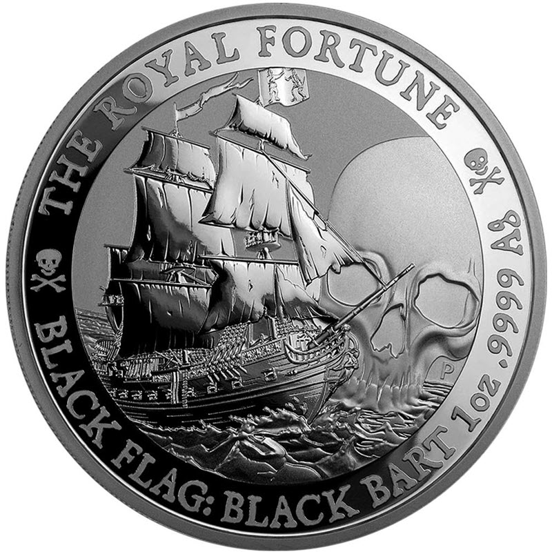 Эта удивительная серебряная монета весом в 1 унцию - вторая из серии «Черный флаг» от Пертского монетного двора и посвящен кораблю «Королевская Удача», которым командовал Бартоломью Робертс, также известный как Черный Барт. Тираж: 15000 штук.