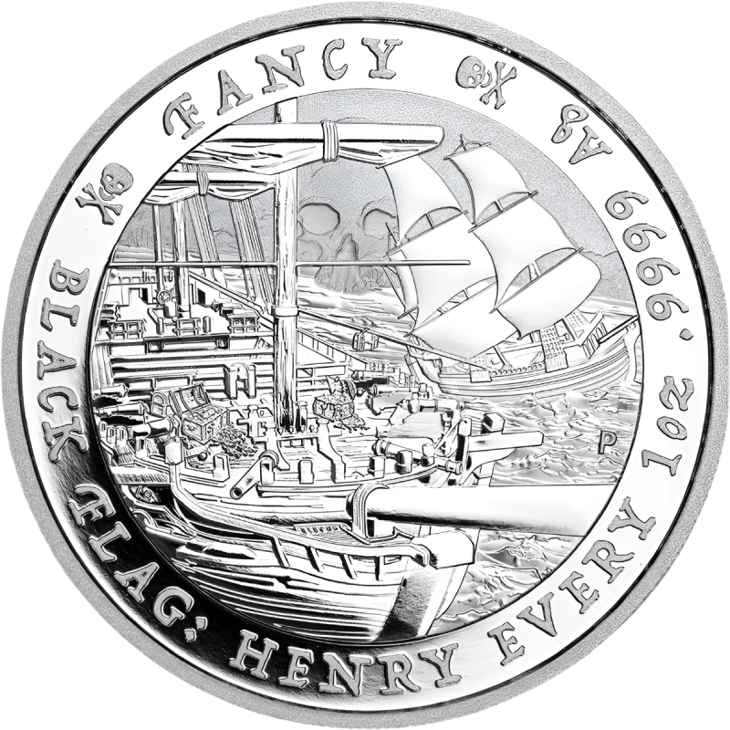 На реверсе изображен пиратский корабль Fancy с сундуками сокровищ на палубе. Вверху контур черепа. Справа у канта: Р (монограмма Пертского монетного двора). Вдоль канта надпись: FANCY BLACK FLAG: HENRY EVERY 1oz .9999 Ag (корабль, Черный флаг, Генри Эвери, вес и проба серебра). FANCY отделена эмблемами пиратов (череп с костями).