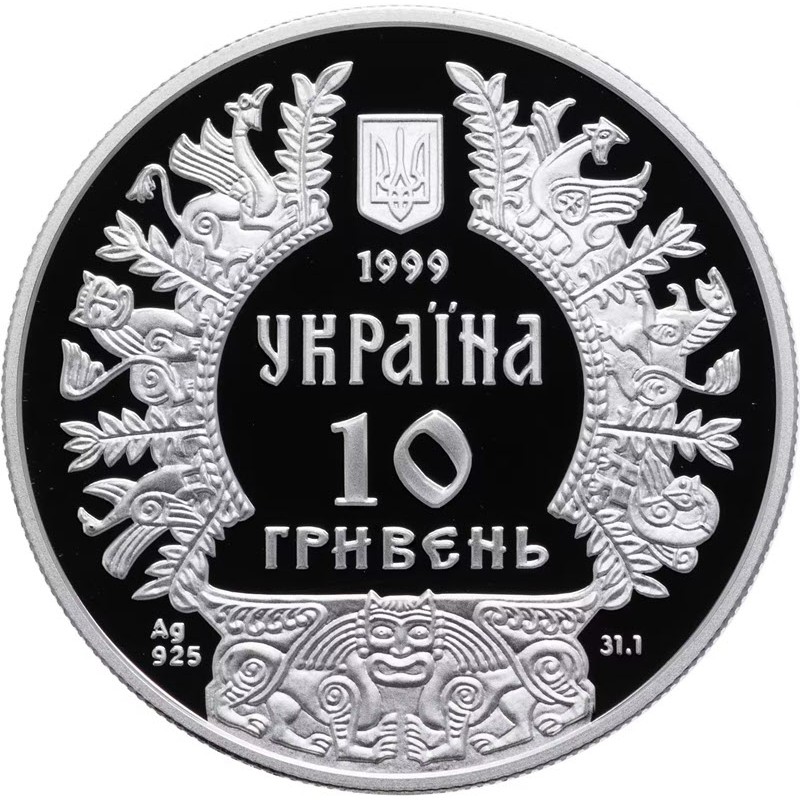 На аверсе изображен древнерусский орнамент. В центре малый герб Украины. Ниже надпись: 1999 УКРАЇНА 10 ГРИВЕНЬ Ag 925 31.1 (год чеканки, страна-эмитент, номинал, вес и проба серебра).