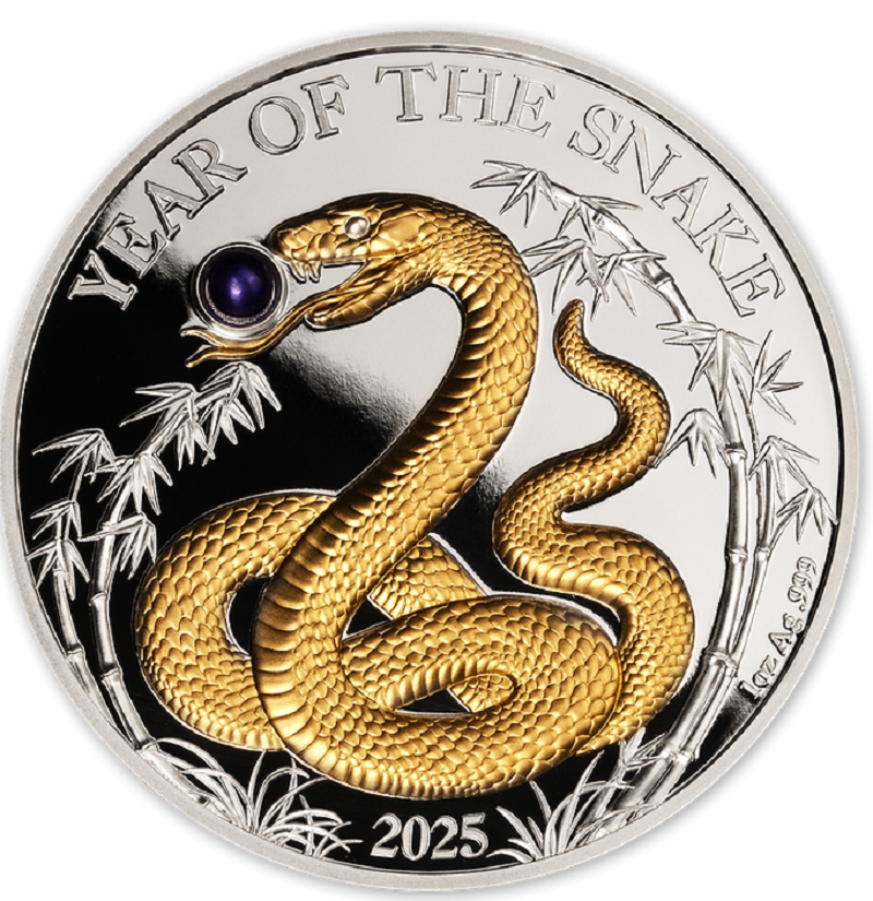 На обратной стороне изображена позолоченная змея, обвивающаяся вокруг голубой жемчужины, символизирующей мудрость, интуицию и изящество. Вверху надпись: YEAR OF THE SNAKE, внизу год выпуска - 2025.