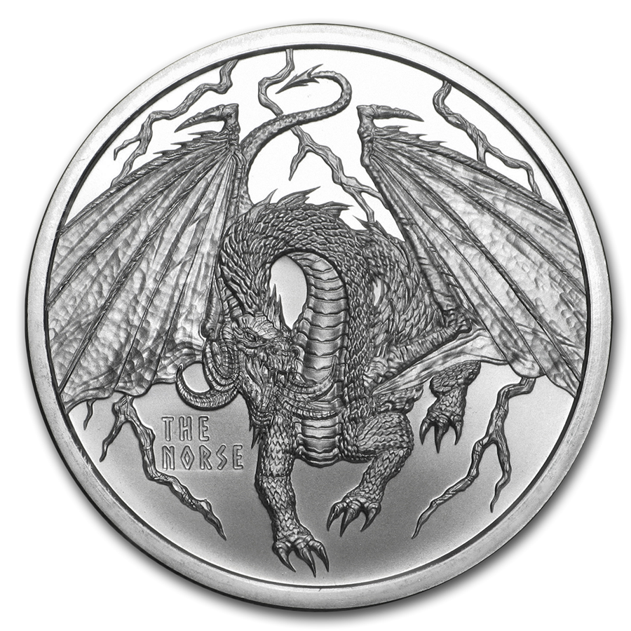 Изображение большого глаза рептилии, окруженного надписями — “World of Dragons” («Мир Драконов»), вес и чистота металла.