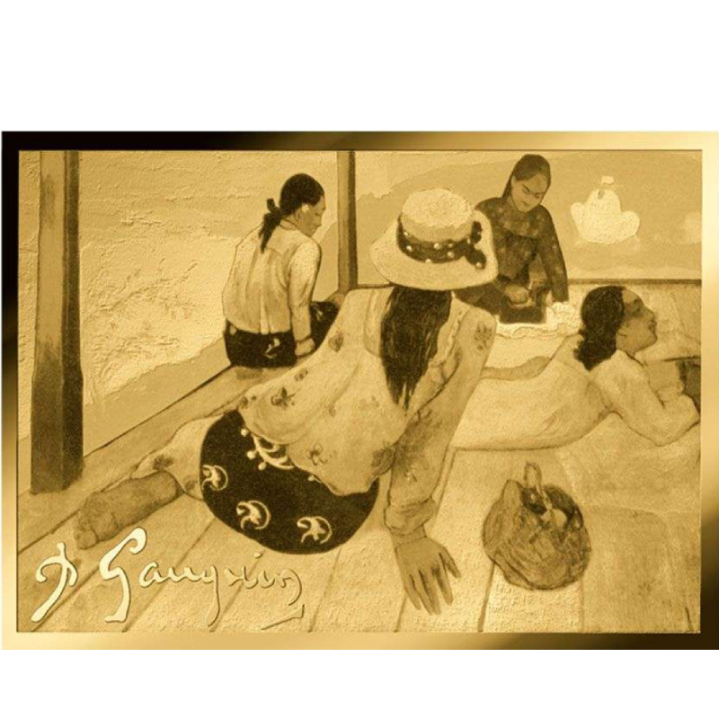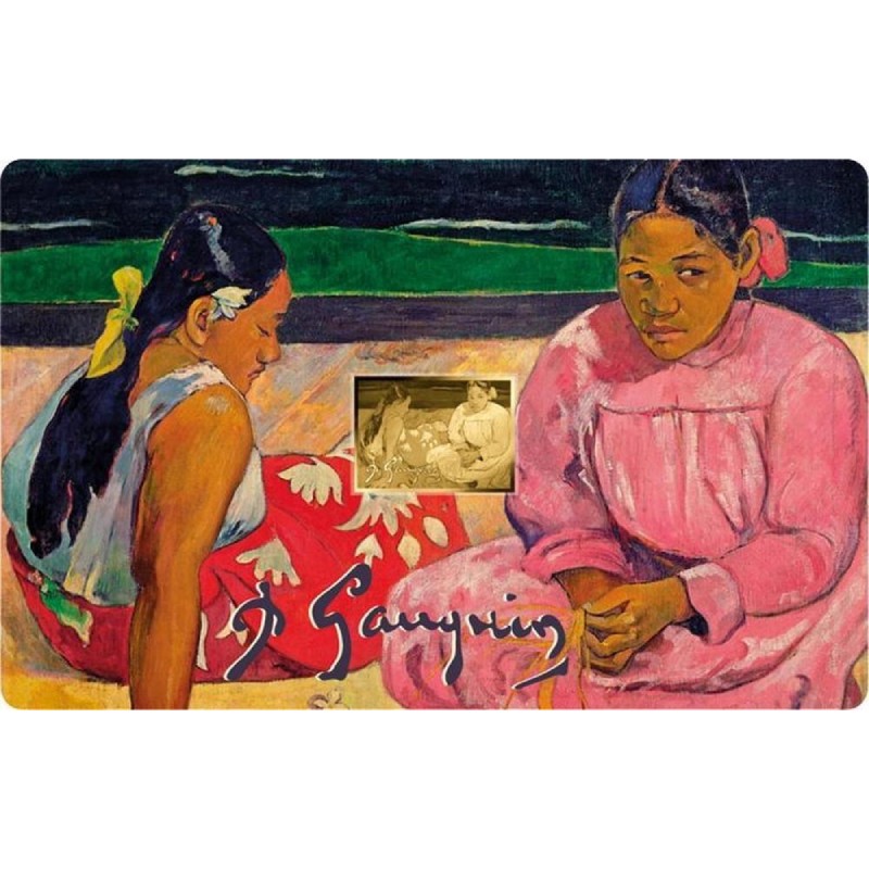 Эта потрясающая золотая монета весом 1/1000 унции посвящена картинам Поля Гогена. У нее размеры 11 Х 15.4 мм и качество пруф-лайк. Поставляется в карточке с сертификатом подлинности. Тираж: 50 000 штук.