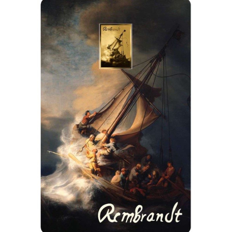 Эта потрясающая золотая монета весом 1/1000 унции посвящена картинам Рембрандта. У нее размеры 11 Х 15.4 мм и качество пруф-лайк. Поставляется в карточке с сертификатом подлинности. Тираж: 50 000 штук.