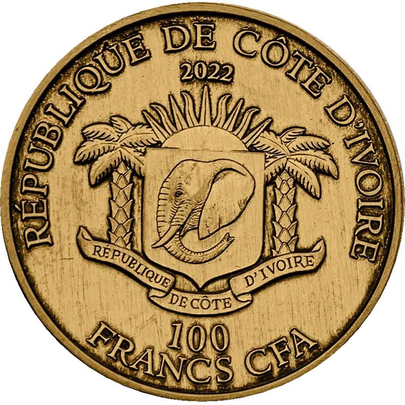 На аверсе изображен герб Кот-д’Ивуара. Над гербом надпись: 2022 (год чеканки). Вверху вдоль канта надпись: RÉPUBLIQUE DE CÔTE D'IVOIRE (страна-эмитент). Внизу надпись в две строки: 100  FRANCS CFA (номинал). На гурте выгравирован индивидуальный серийный номер монеты.