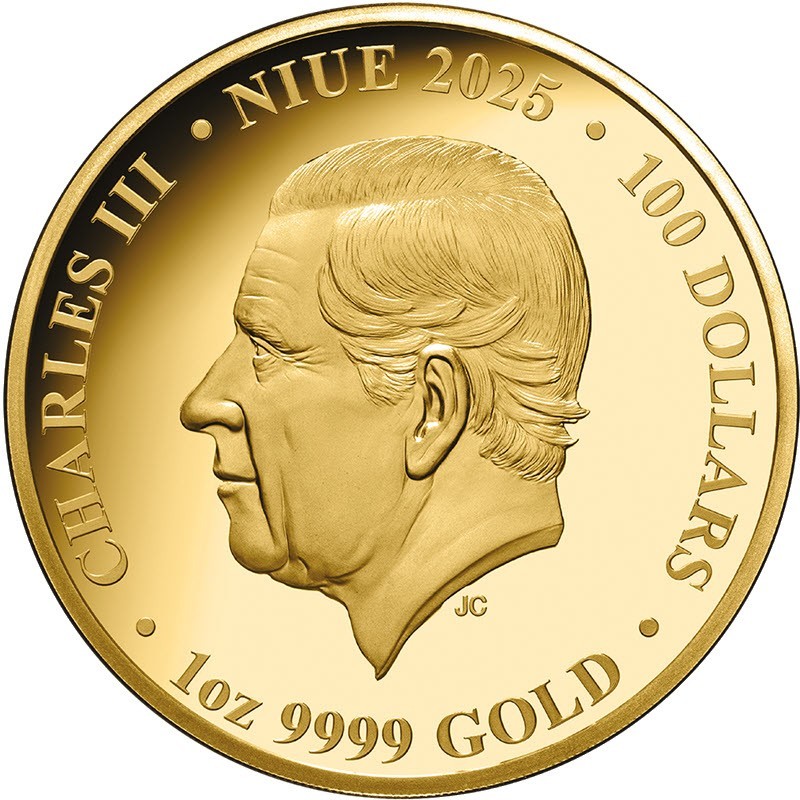На аверсе изображен Его Величество король Чарльз III. На усечении шеи инициалы дизайнера JC (Jody Clark). Вдоль канта надпись: CHARLES III · NIUE 2025 · 100 DOLLARS · 1oz 9999 GOLD · (Чарльз III, страна-эмитент, год чеканки, номинал, вес и проба золота).