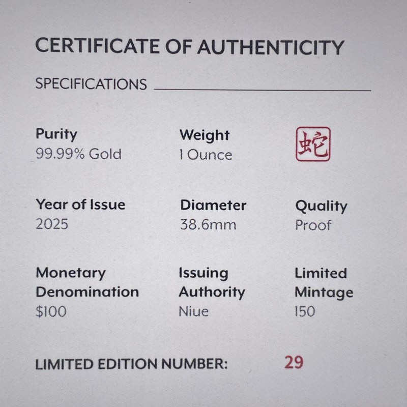 Золотая монета весом 1 унция посвящена символу 2025 года - Змее. У нее качество пруф. Поставляется в оригинальном футляре с сертификатом подлинности. Тираж: 150 штук.