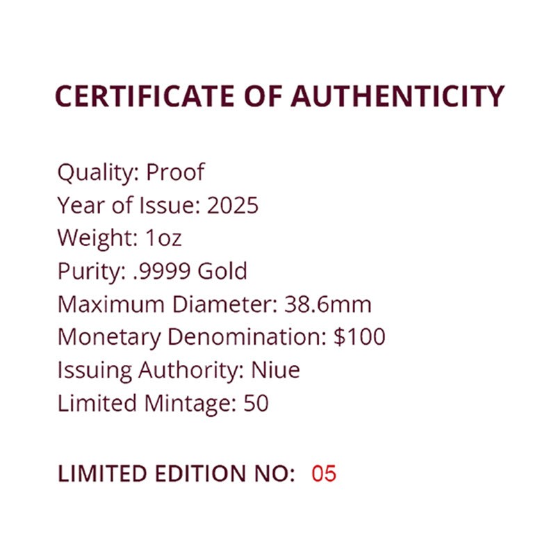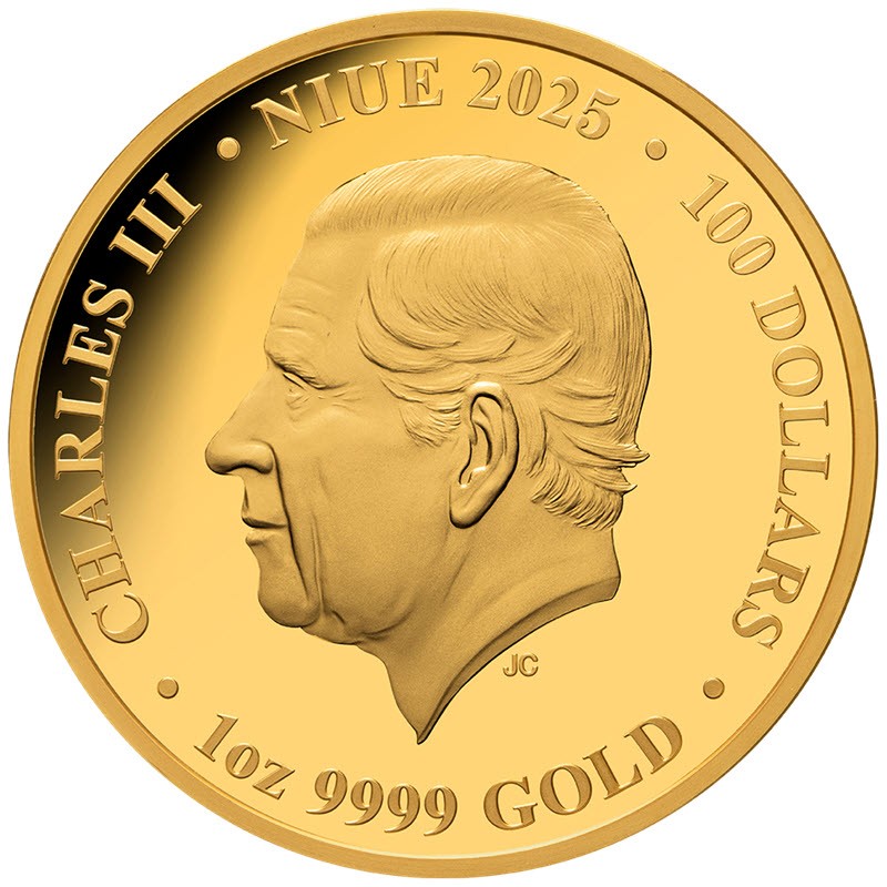 На аверсе изображен Его величество Король Чарльз III. Под шеей инициалы дизайнера Джоди Кларк (JC, Jody Clark). Вдоль канта надписи: CHARLES III · NIUE 2025 · 100 DOLLARS · 1oz 9999 GOLD · (Чарльз III, страна-эмитент, год чеканки, номинал, вес и проба золота).