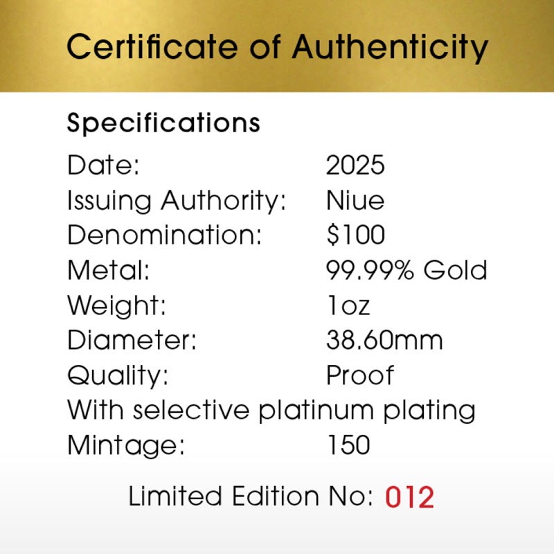 На аверсе изображен Его величество Король Чарльз III. Под портретом инициалы дизайнера JC (Jody Clark). Вдоль канта надпись: CHARLES III · NIUE 2025 · 100 DOLLARS · 1oz 9999 GOLD · (Чарльз III, страна-эмитент, год чеканки, номинал, вес и проба золота).