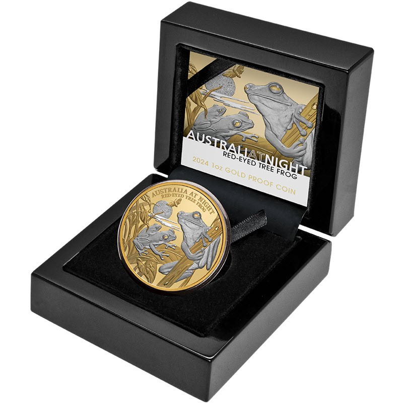 Золотая монета Ниуэ "Ночная Австралия. Красноглазая древесная лягушка" 2024 г.в. (пруф), 31.1 г чистого золота (проба 9999)