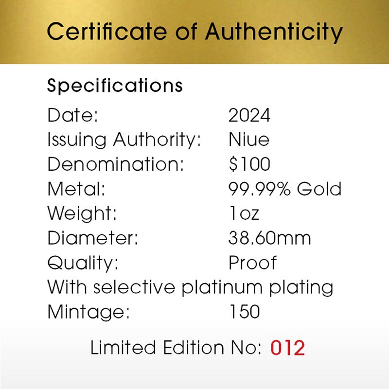 На аверсе изображен Его величество Король Чарльз III. Под портретом инициалы дизайнера JC (Jody Clark). Вдоль канта надпись: CHARLES III · NIUE 2024 · 100 DOLLARS · 1oz 9999 GOLD · (Чарльз III, страна-эмитент, год чеканки, номинал, вес и проба золота).