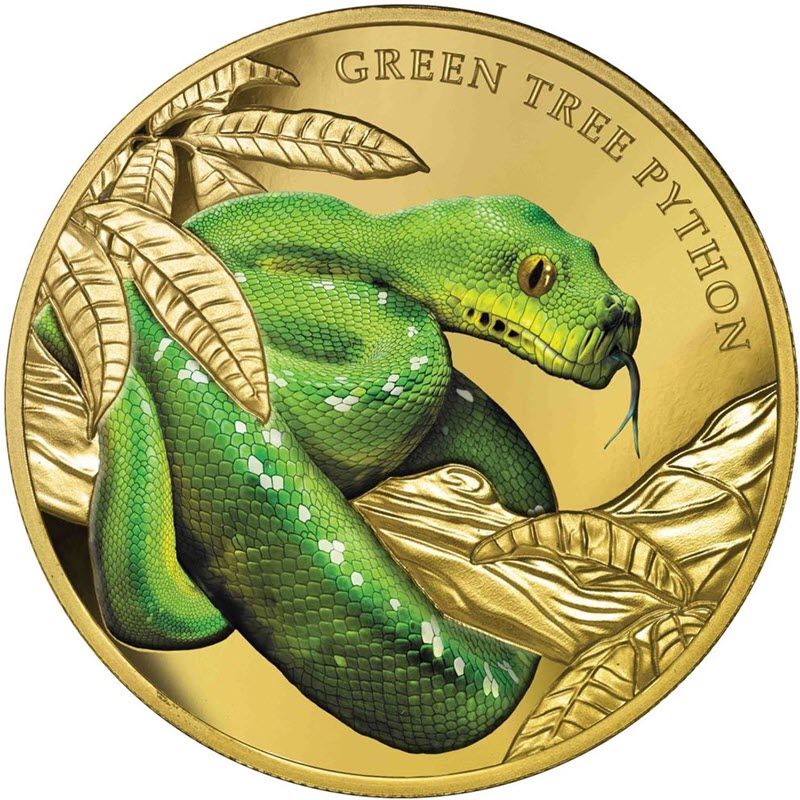 Полноцветное изображение зеленого древесного питона, свернувшегося на золотой ветке. Сверху написано название монеты