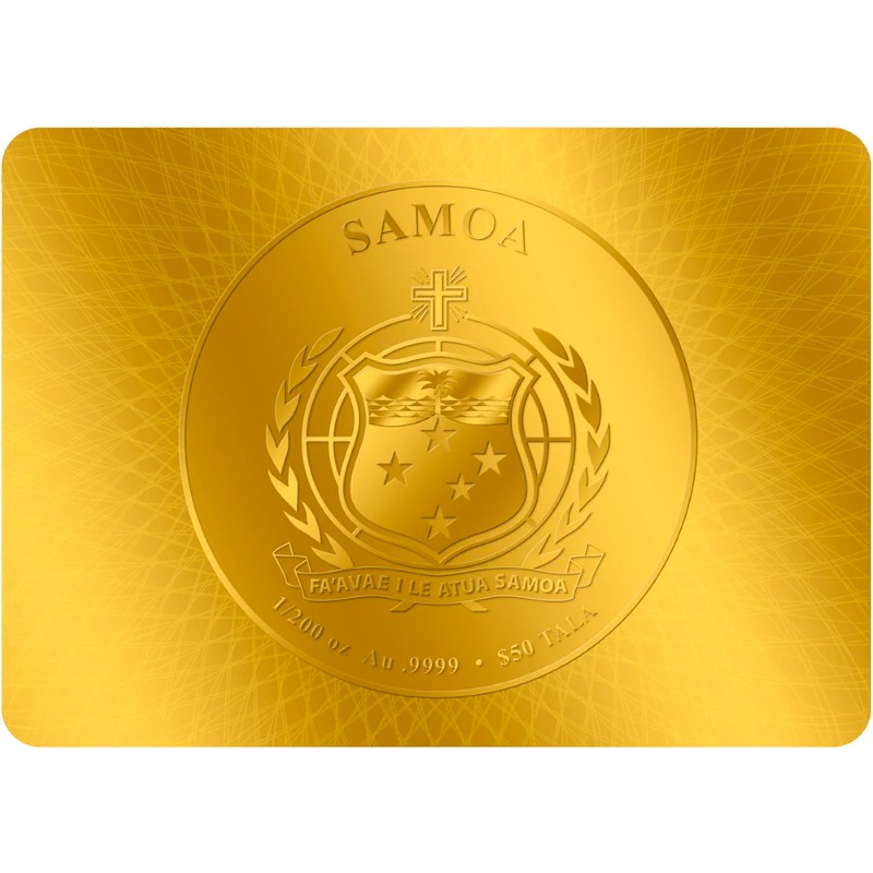 В центре в круге изображен герб Самоа. Надпись на ленте: Fa'avae I Le Atua Samoa (Бог да будет Основой Самоа). Внизу по кругу надписи: 1/200 oz Au .9999 ∙ $50 TALA (вес и проба золота, номинал). Вверху: SAMOA (страна-эмитент).