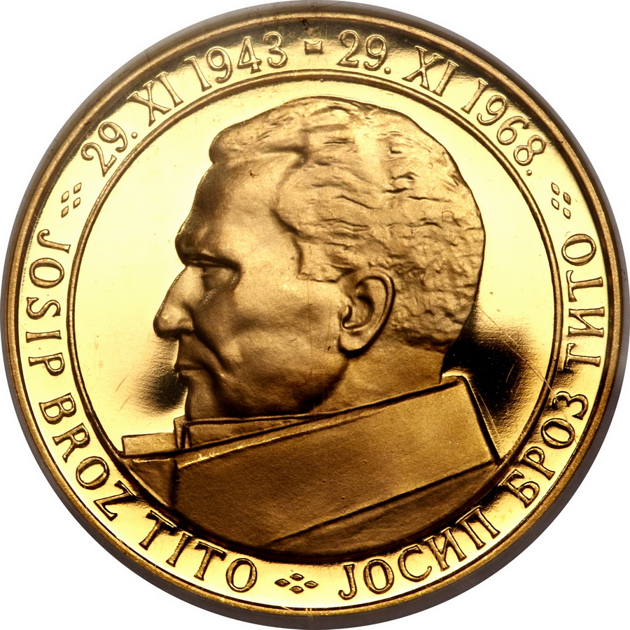 Золотая монета Югославии «Иосип Броз Тито» 1968 года выпуска является частью серии «25-летие республики».
