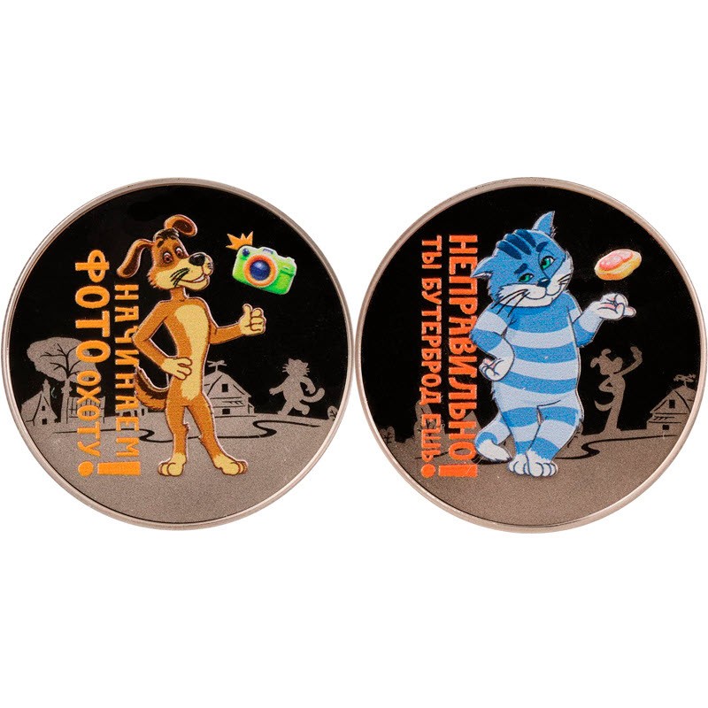 На реверсе одного жетона изображен Матроскин. Слева надпись: НЕПРАВИЛЬНО ТЫ БУТЕРБРОД ЕШЬ!