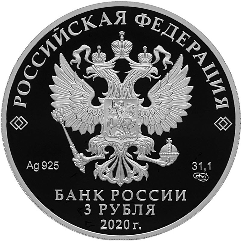 На аверсе в центре — рельефное изображение Государственного герба Российской Федерации, вверху вдоль канта надпись: РОССИЙСКАЯ ФЕДЕРАЦИЯ, обрамленная с обеих сторон сдвоенными ромбами, внизу под гербом надпись: Ag 925 31,1 СПМД (вес и проба серебра, монограмма монетного двора), ниже надпись в три строки: БАНК РОССИИ 3 РУБЛЯ 2020 г. (банк, номинал, год чеканки).