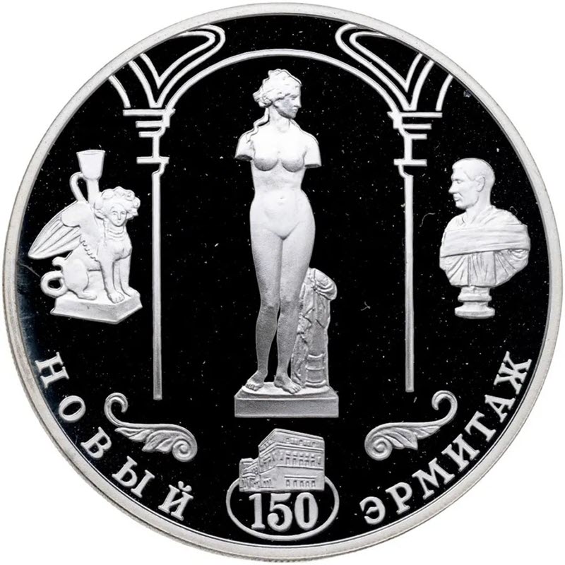 На реверсе изображена статуя Венеры Таврической, слева - лекиф в виде сфинкса (V в. до н.э.), справа - скульптурный портрет римского императора Филиппа I Араба (III в.). Внизу надпись: НОВЫЙ ЭРМИТАЖ, разделенная датой в овале: 150 (юбилей), над ней - здание Нового Эрмитажа.