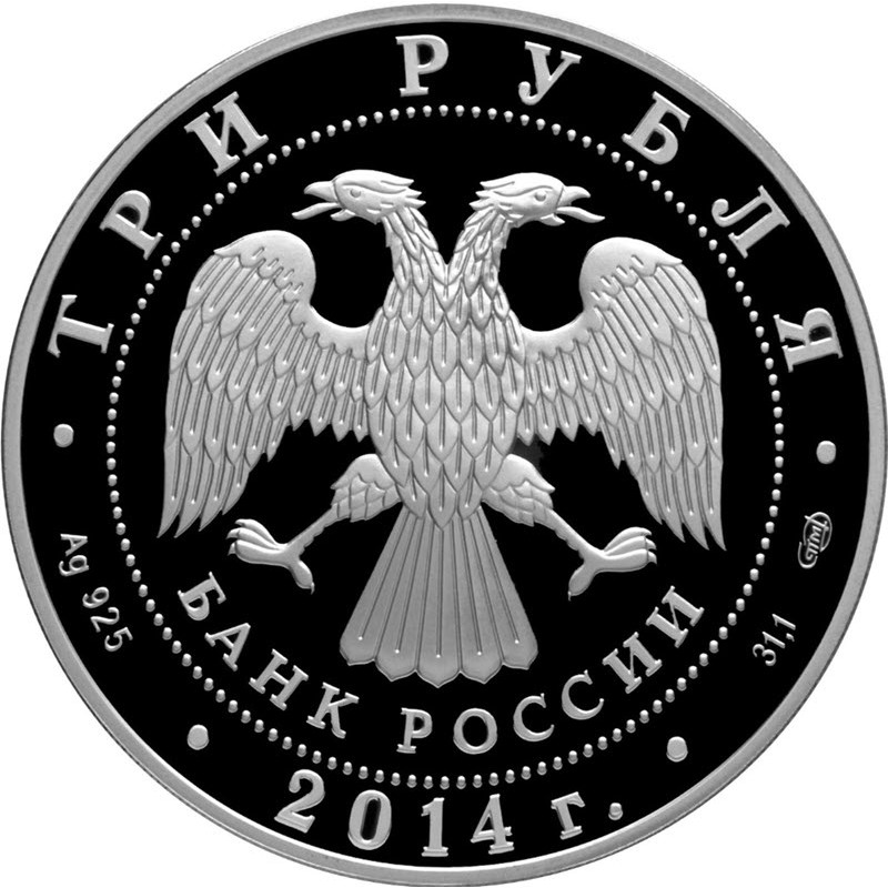 На аверсе изображена эмблема Банка России (двуглавый орел с опущенными крыльями), под ним надпись: БАНК РОССИИ. Вдоль канта надпись: • ТРИ РУБЛЯ • Ag 925 • 2014 г. • 31,1 СПМД • (номинал, вес и проба серебра, год чеканки, монограмма Санкт-Петербургского монетного двора).