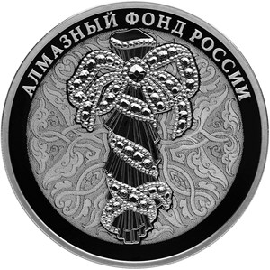 в центре диска на фоне элементов традиционного русского орнамента изображение портбукета, вверху вдоль канта – надпись: "АЛМАЗНЫЙ ФОНД РОССИИ".