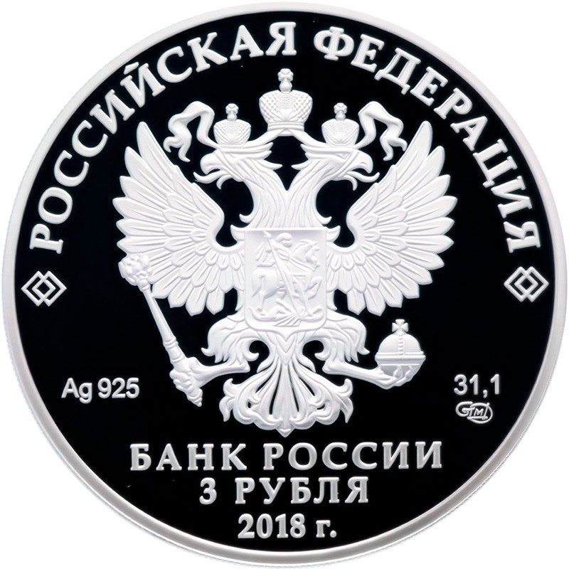 Рельефное изображение Государственного Герба Российской Федерации. Над ним вдоль канта надпись: РОССИЙСКАЯ ФЕДЕРАЦИЯ. Герб разделяет надпись: Ag 925 31,1 СПМД (вес и проба серебра, монограмма монетного двора). Внизу надпись в три строки: БАНК РОССИИ 3 РУБЛЯ 2018 г. (банк, номинал, год чеканки).