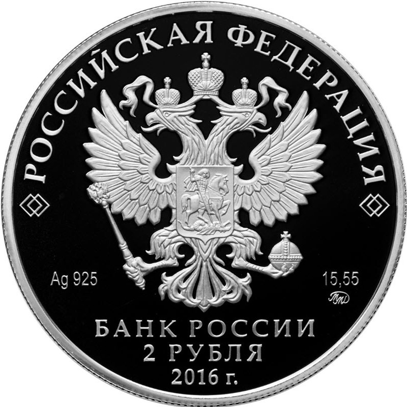 На аверсе в центре — рельефное изображение Государственного герба Российской Федерации, вверху вдоль канта надпись: РОССИЙСКАЯ ФЕДЕРАЦИЯ, обрамленная с обеих сторон сдвоенными ромбами, внизу под гербом надпись: Ag 925 15,55 ММД (вес и проба серебра, монограмма Московского монетного двора), ниже надпись в три строки: БАНК РОССИИ 2 РУБЛЯ 2016 г. (банк, номинал, год чеканки).