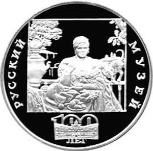 На реверсе фрагмент картины «Купчиха за чаем» художника Б.М. Кустодиева, внизу — Мраморный дворец и дата: 100 ЛЕТ, вдоль канта надпись: РУССКИЙ МУЗЕЙ.
