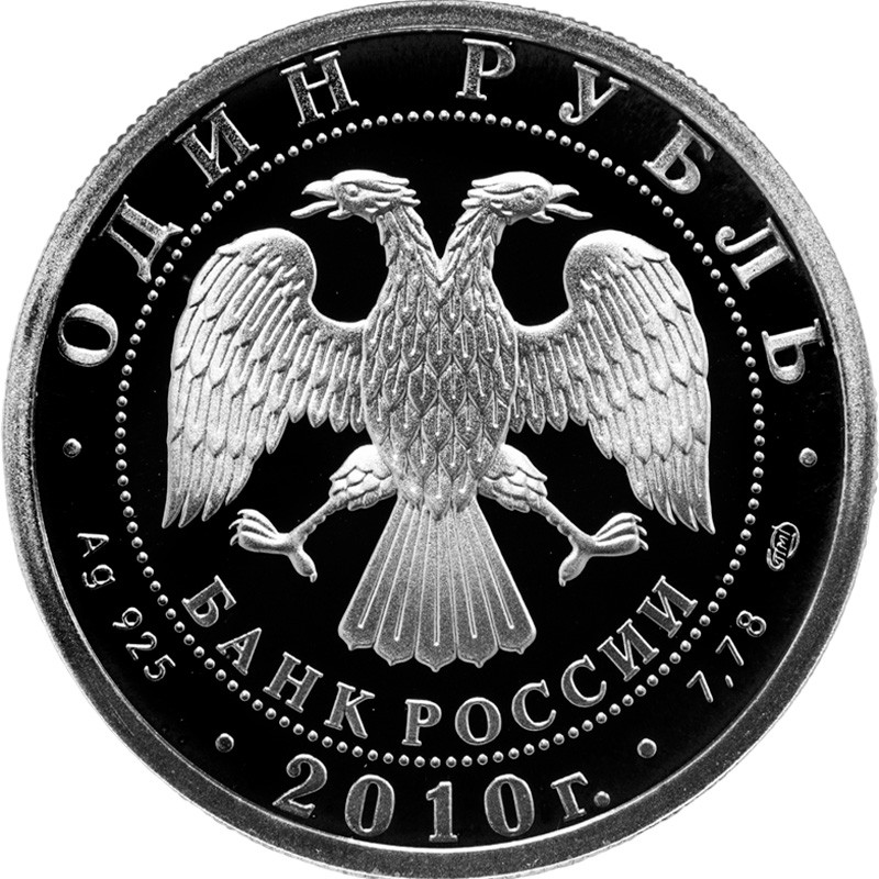Рельефное изображение эмблемы Банка России.  Над ним вдоль канта надпись: ОДИН РУБЛЬ (номинал). Слева надпись: Ag 925 (проба серебра), справа: 7,78 СПМД (вес серебра, монограмма монетного двора). Внизу надпись в две строки: БАНК РОССИИ 2010 г. (банк, год чеканки).