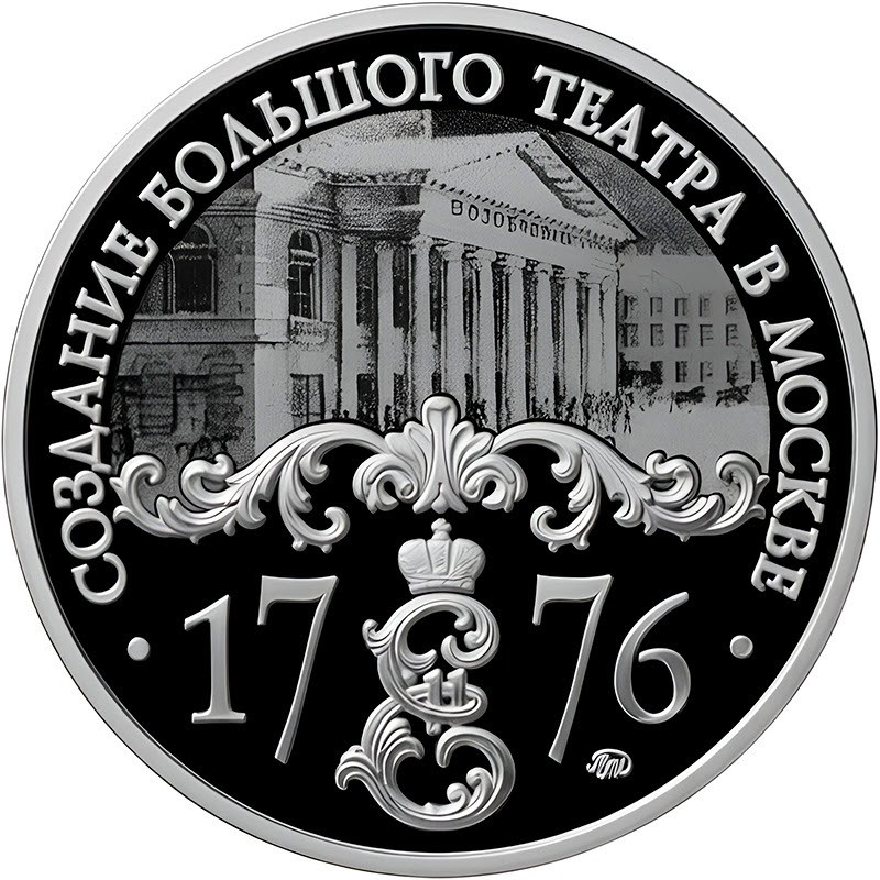 На аверсе изображено старое здание Большого театра (Петровский театр). Внизу расположен вензель императрицы Екатерины II. Вверху надпись: СОЗДАНИЕ БОЛЬШОГО ТЕАТРА В МОСКВЕ, внизу вензель делит: 1776 (год основания).