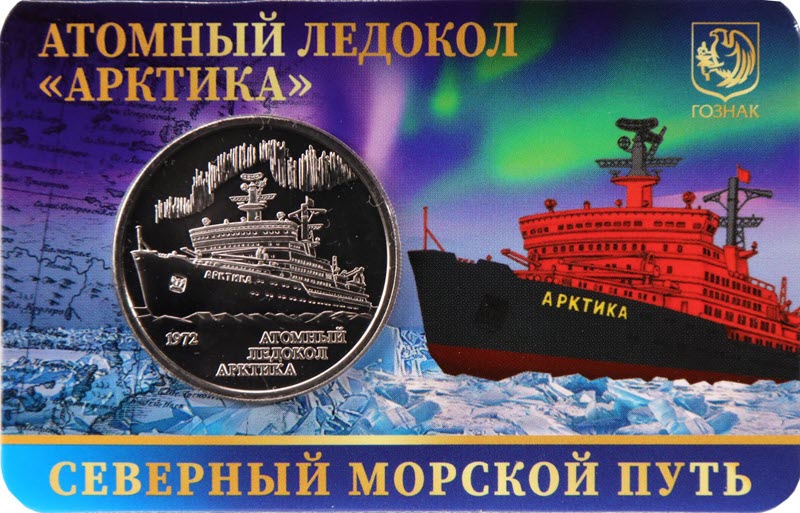 Медно-никелевый жетон ММД 2025 года посвящен 50-летию введения в эксплуатацию атомного ледокола «Арктика». У него качество анциркулейтед. Поставляется в блистере. Тираж: 1500 штук.