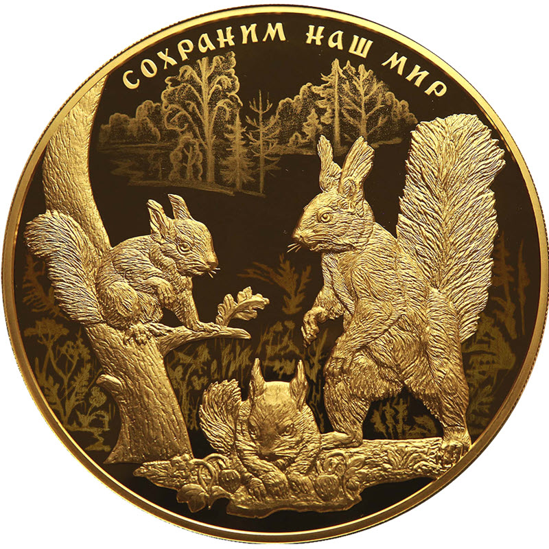 рельефное изображение белки с двумя бельчатами на фоне выполненного в технике лазерного матирования изображения леса; вверху по окружности имеется рельефная надпись «СОХРАНИМ НАШ МИР».